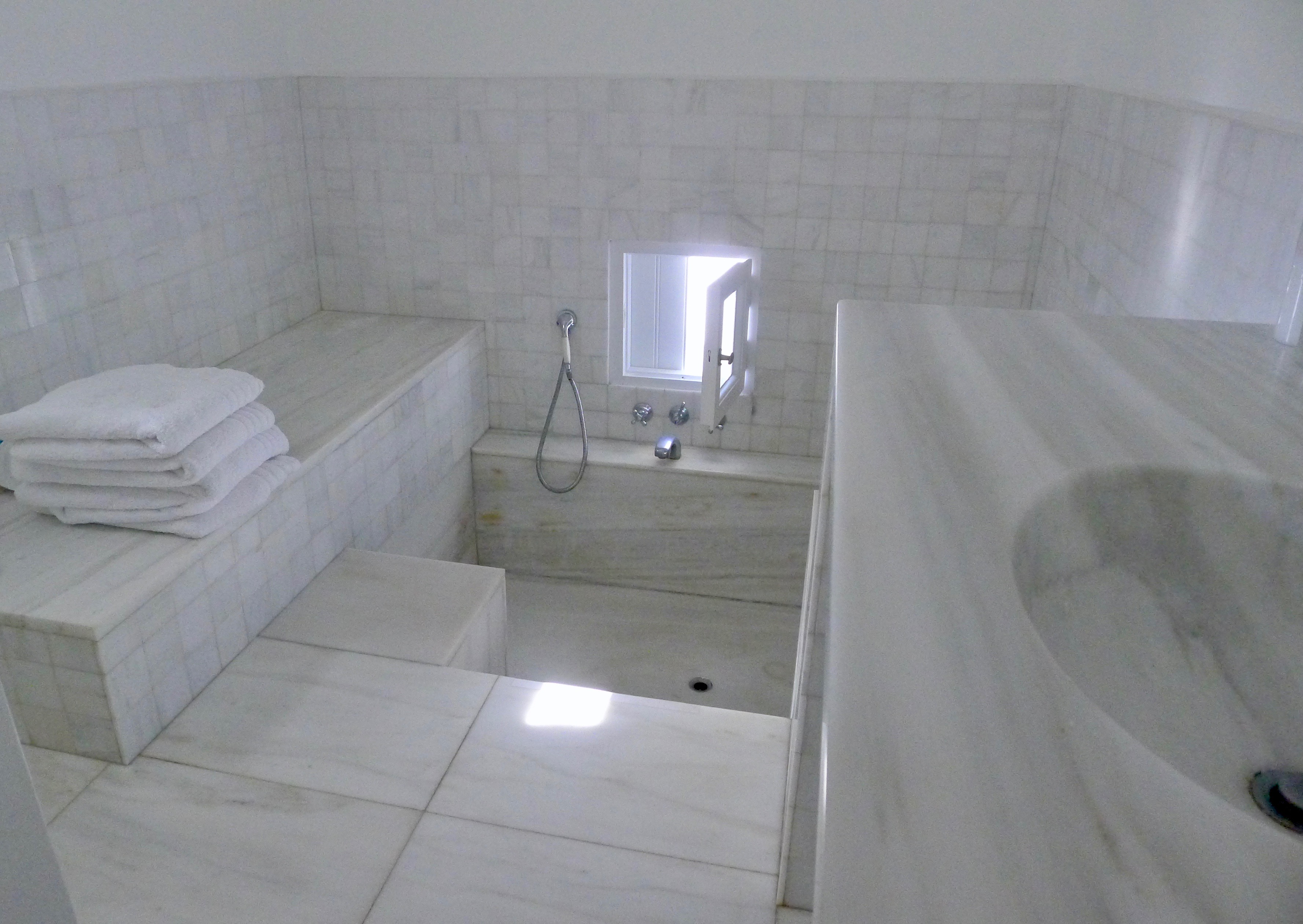 The property can host a group of up to 8 guests in 3 en-suite bedrooms and there is also an en-suite independent guest house. Two of the bedrooms are located on the main level and have private verandas. The Master bedroom with its walk-in closet, regal bathroom and ample space is an example of exceptional architectural talent and good taste. The same care and attention to details is evident in many aspects of this unique family get-away. Equally impressive is the welcoming atmosphere and warm hospitality offered by the owner. This is evident the moment one enters the large living/reception area. On this level, there is one bedroom, (twin) with an elegant bathroom and its own private entrance.  This is perfect for guests that stay up late enjoying the famous Mykonos night life.