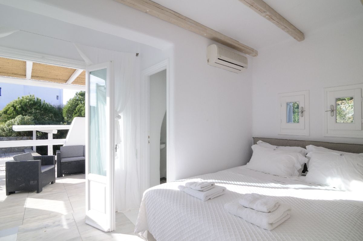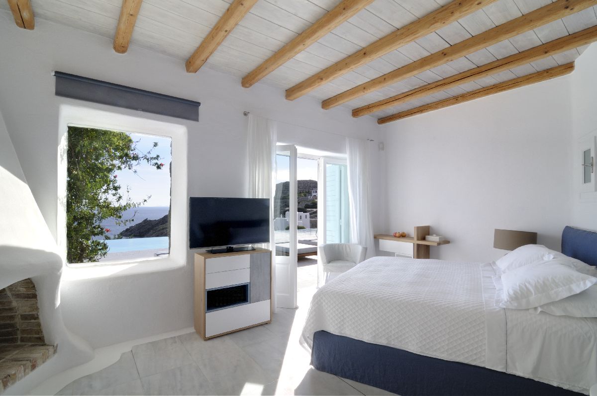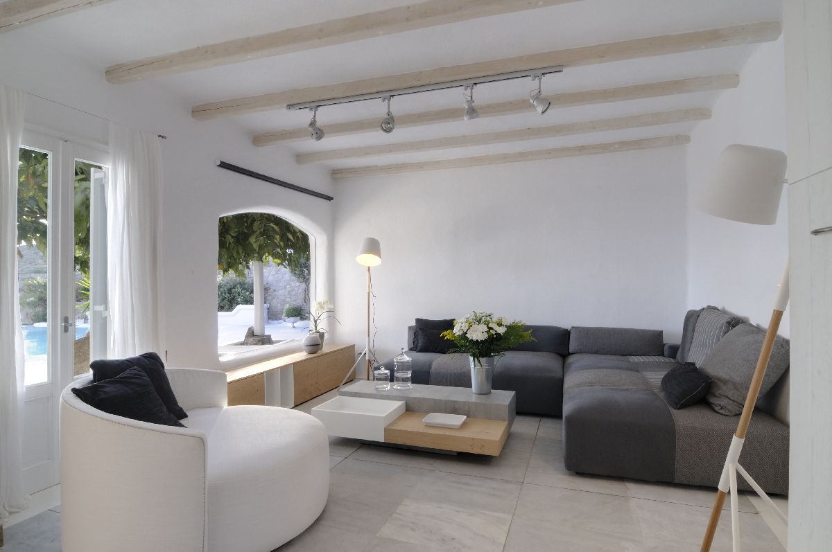 The Villa is completely air conditioned and tastefully furnished in a bright clean uncluttered minimalistic style at the same time incorporating the white walls and wooden beams that are part of the traditional Cycladic architecture. The rooms are all comfortable with en suite bathrooms and off-white wooden floors making this Mykonos Grand Villa a top choice for couples and family vacationing.