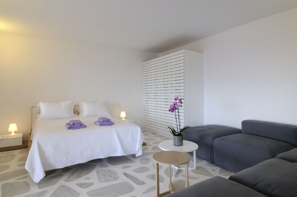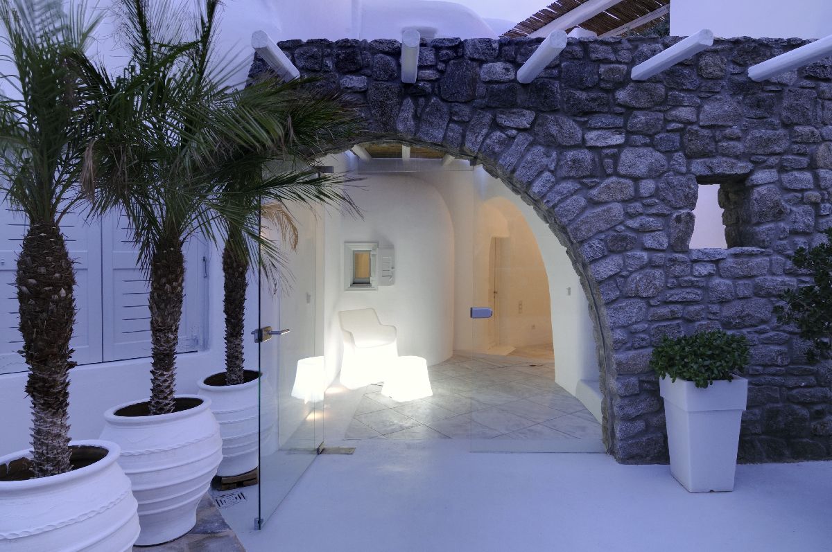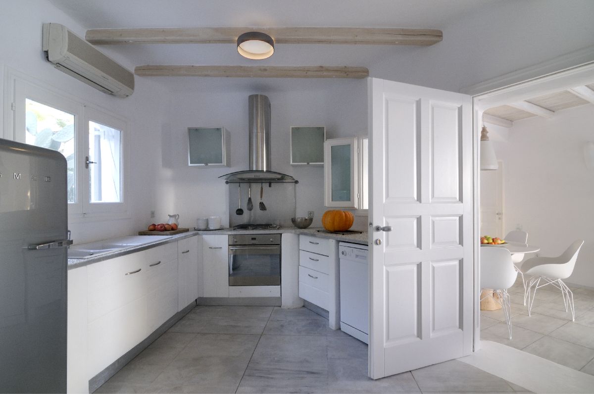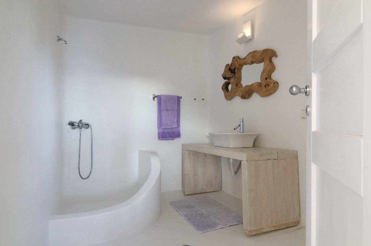 The Villa is completely air conditioned and tastefully furnished in a bright clean uncluttered minimalistic style at the same time incorporating the white walls and wooden beams that are part of the traditional Cycladic architecture. The rooms are all comfortable with en suite bathrooms and off-white wooden floors making this Mykonos Grand Villa a top choice for couples and family vacationing.