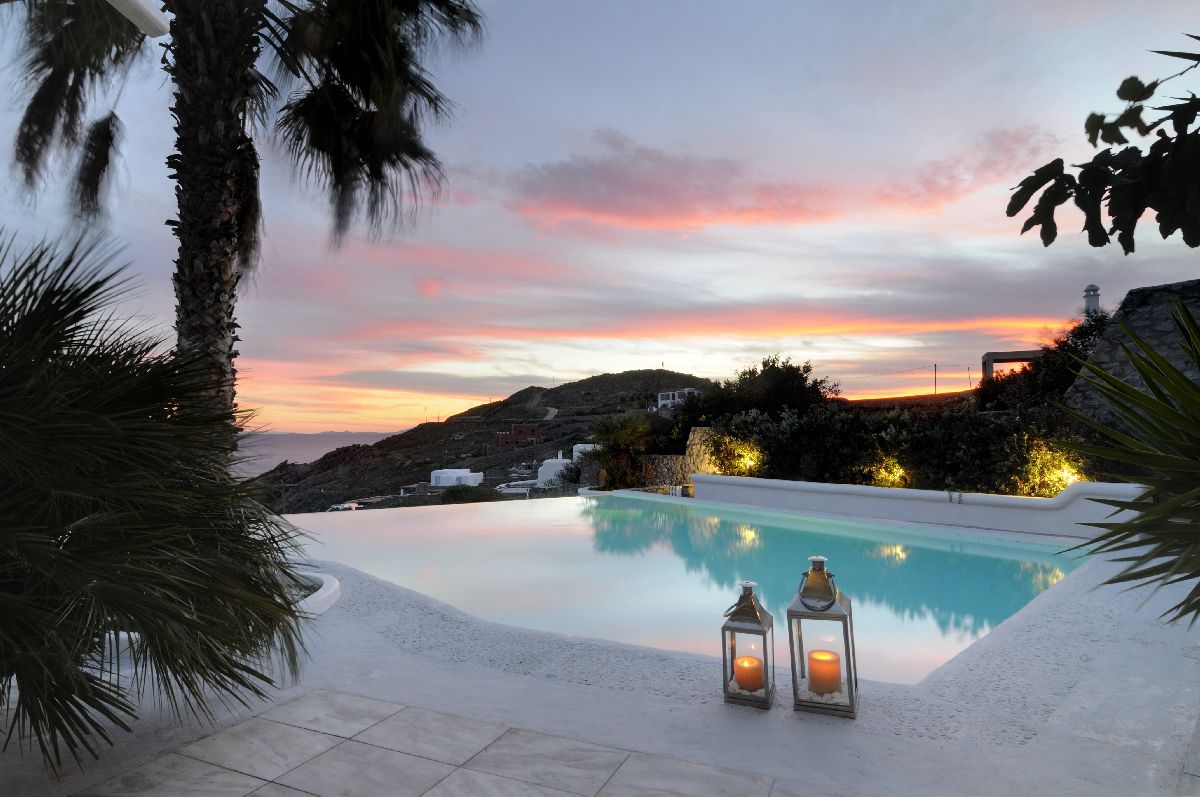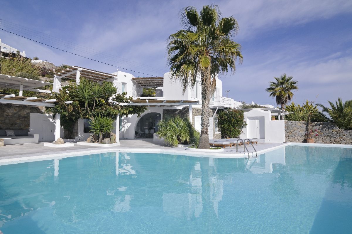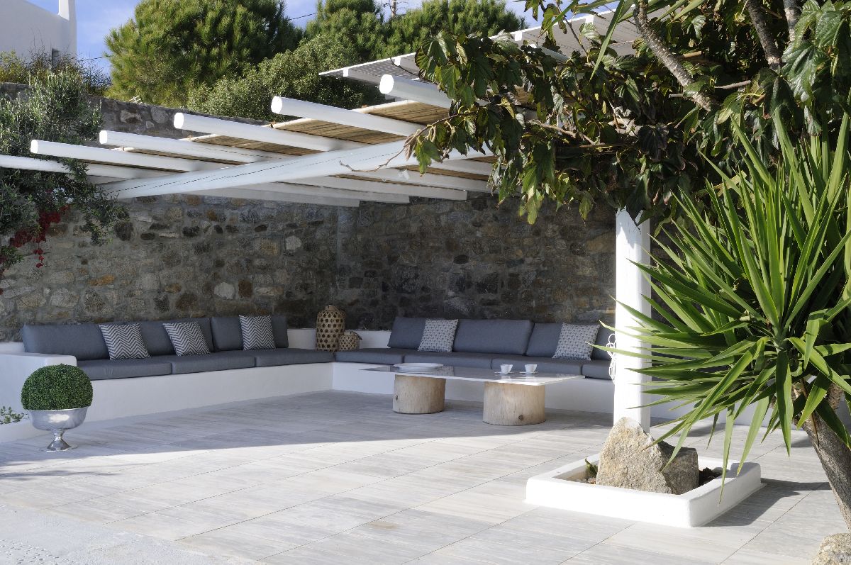 Isidora is a modern designed and elegantly furnished Grand Villa, located in Aleomandra on the South-western part of Mykonos. It overlooks the islands of Naxos and Paros to the South. It is one of the few Villas on Mykonos that is protected from the strong northern winds of August. The outstanding aspects of this villa are its well designed floor plan and the harmony that exists between the villa and the existing Mykonian landscape. It offers an unobstructed sea view from every room. The 120m², L-shaped infinity swimming pool with the large pergola shaded sitting and dining area is a favourite gathering place for the guests.